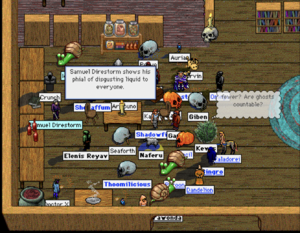 - After the performances, the scores provided by the distinguished judges were unceremoniously thrown out due to possible judge bribery and/or tampering, and instead the attendees were invited to vote. Apparently Puddleby feels that summoning horrifying shadow monstrosities isn't a desired part of a dance presentation, so Inu's shadow fiends came last and were subjected to brutal mockery, cheerfully provided by Pun'isher. In the end the voting was very close, but my own clan's entry was victorious! To paraphrase Stinkfist: "Red Quill winning a RP-related event, what a surprise."